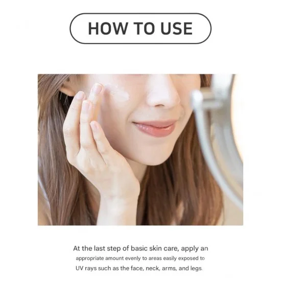 আপনার ত্বকের যত্নের রুটিনের শেষ ধাপ হিসেবে, মুখ, ঘাড়, বাহু এবং পায়ের মতো সূর্যের আলোর সংস্পর্শে আসা জায়গাগুলিতে সমানভাবে উপযুক্ত পরিমাণে প্রয়োগ করুন।