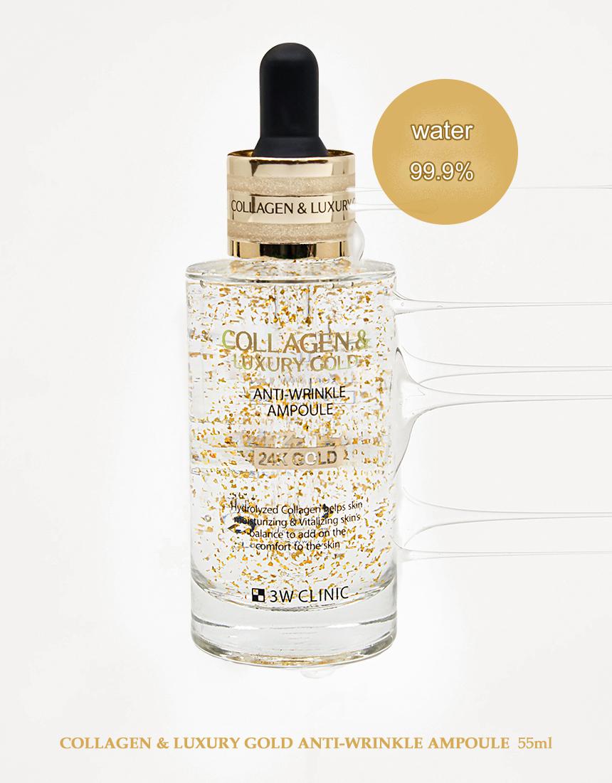 3W ক্লিনিক কোলাজেন এবং লাক্সারি গোল্ড অ্যান্টি-রিঙ্কল অ্যাম্পুল হল সোনার কণা সহ একটি পুনরুদ্ধারকারী অ্যাম্পুল সিরাম।